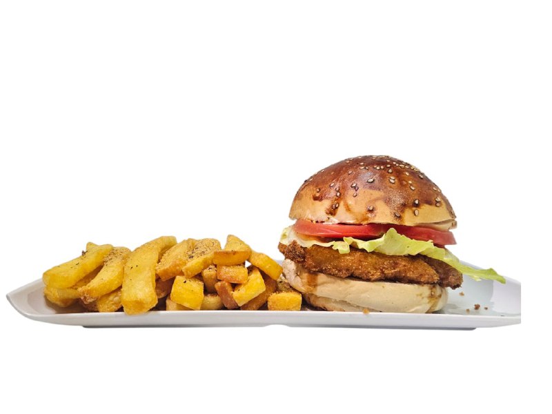 Taze hamburger ekmeği, satır kıyma ile özenle hazırlanmış çıtır burger köftesi, domates, marul, chili sos, iri çıtır patates kızartması, paket ketçap, paket mayonez